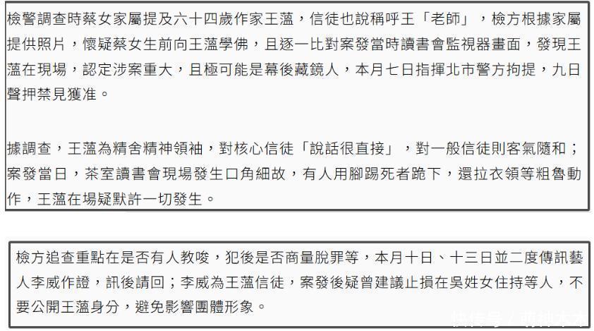 有媒体曝光了王蕰的身份,除了是知名作家之外,他还是所谓精神领袖,有着一批信众,还分核心与非核心,李威被牵扯进命案,正是因为他疑似想要保护王蕰,还跟对方提了建议。