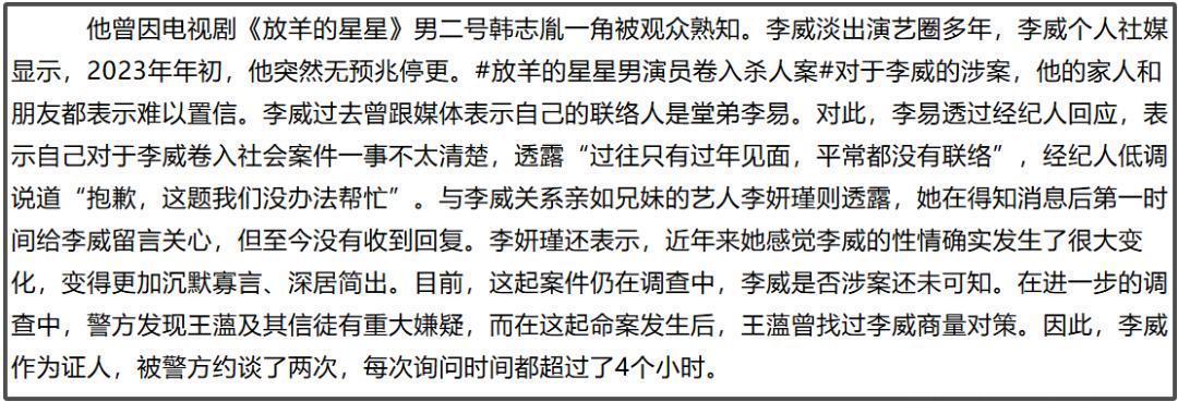 家人也说和李威只有过年联络,圈内好友则表示和李威好几年没联系,经纪人回应不知道情况……