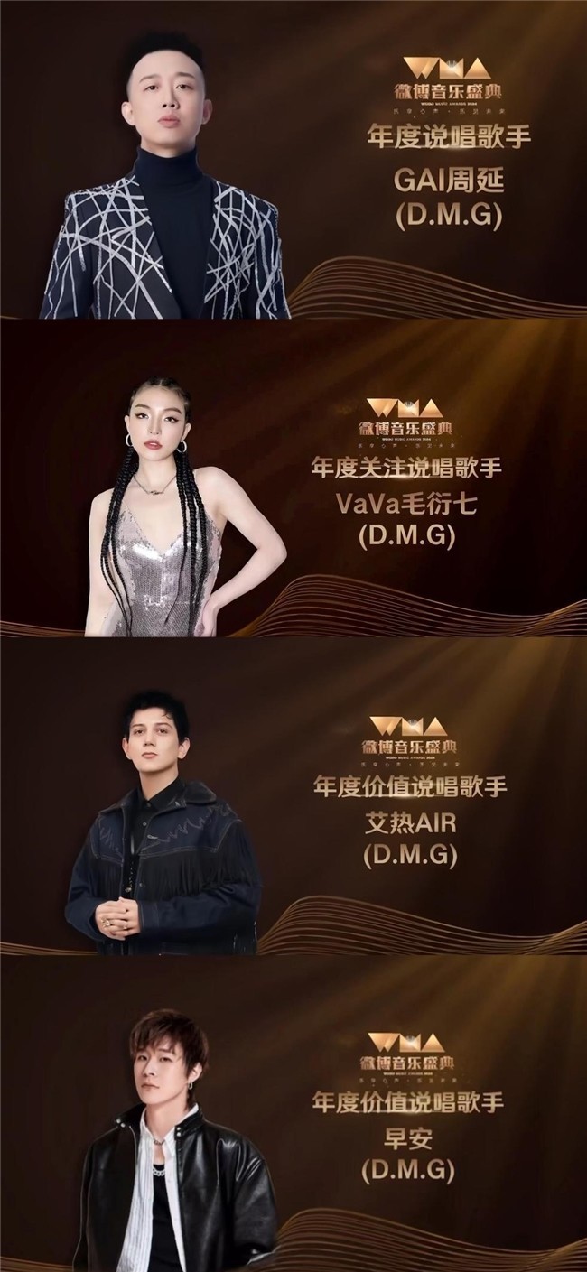 2024年9月28日,微博音乐盛典,种梦音乐D.M.G艺人斩获四项荣誉大奖,GAI周延被授予微博音乐盛典“年度说唱歌手”奖,这也是他第五次获此殊荣。VaVa毛衍七获“年度关注说唱歌手”奖,艾热AIR、早安获“年度价值说唱歌手”奖。