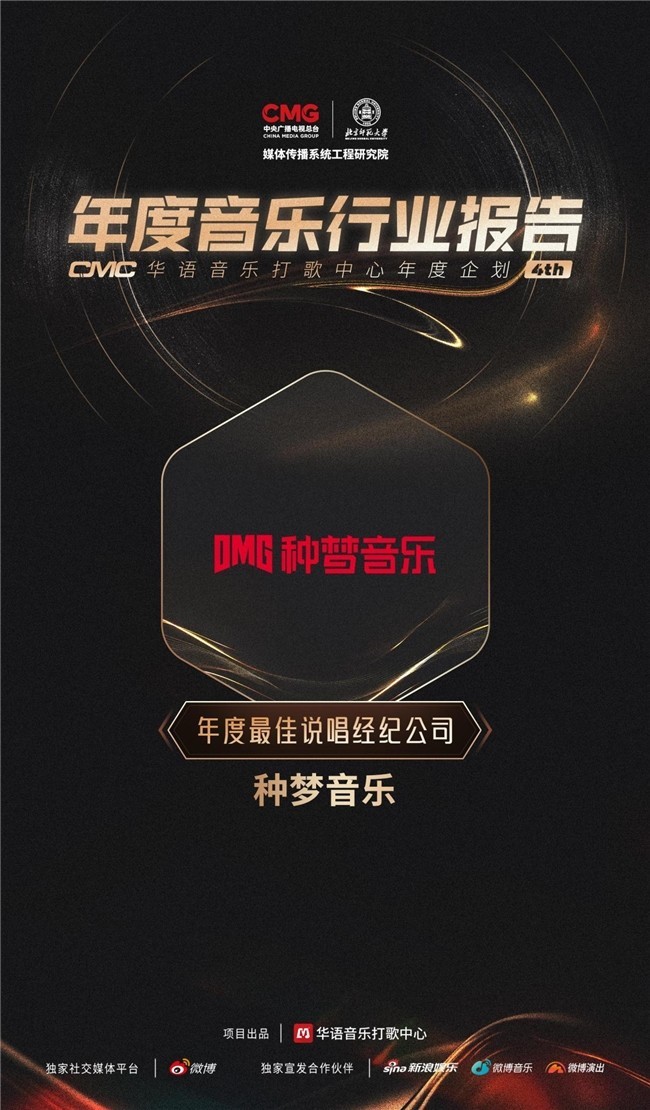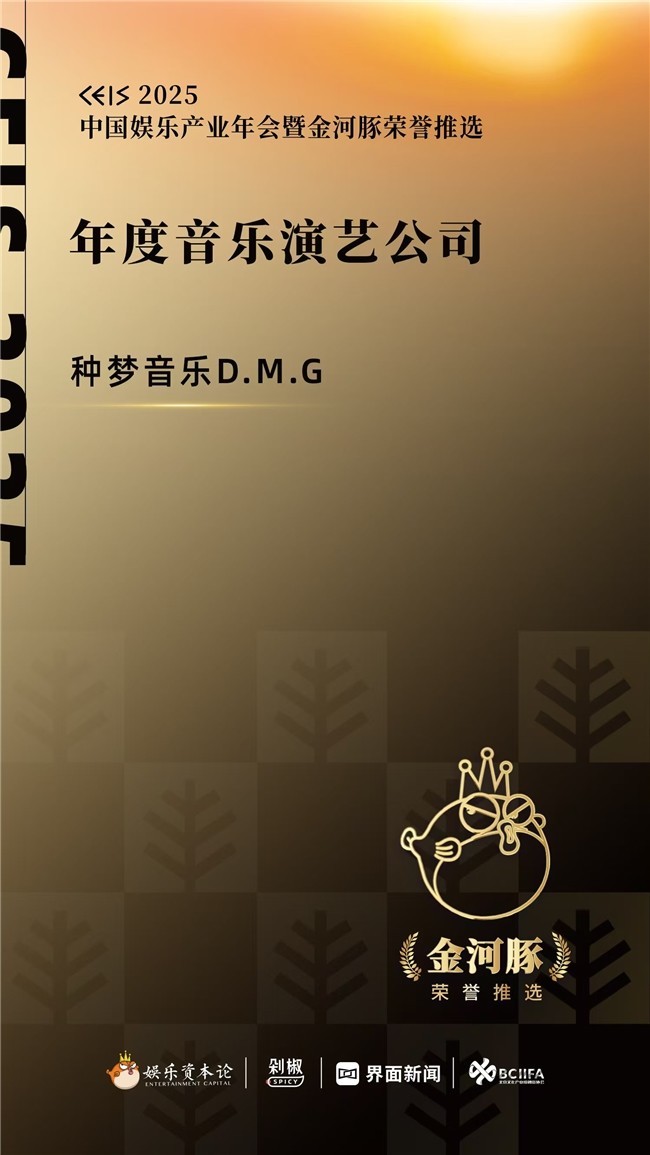 2025年1月9日,以「岁寒松柏青」为主题,横跨电影、长剧、短剧、音乐等八大领域的CESI2025中国娱乐产业年会暨金河豚荣誉推选在京举办,种梦音乐D.M.G连续两年获奖,被评为“年度音乐演艺公司”,嘉奖公司过去一年在内容与商业上取得的卓越成就。