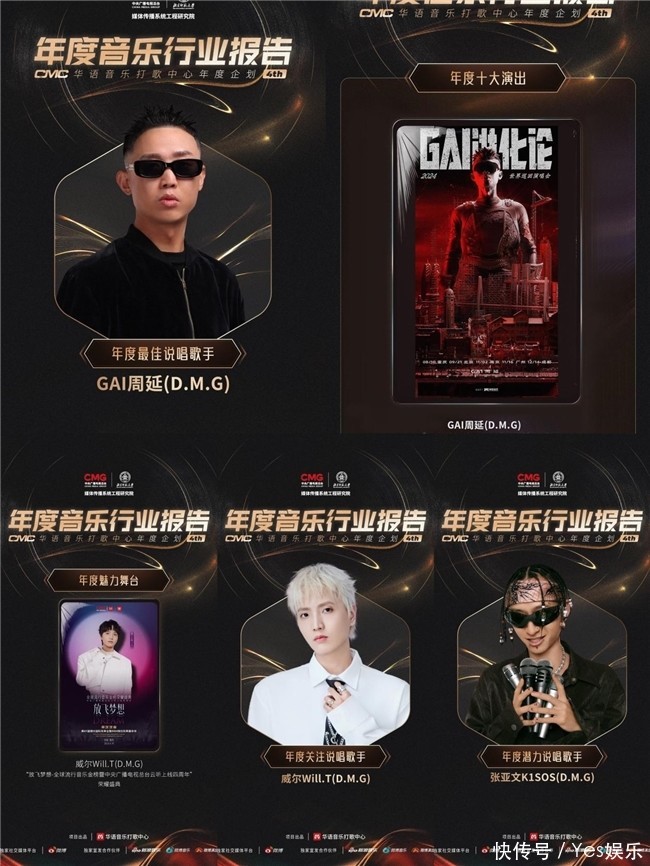 2024年12月26日,由中共中央宣传部、国家广电总局指导,中央广播电视总台和新华频媒联合出品的全国首档数字时代华语音乐打歌秀《华语音乐打歌中心》发布2024年度音乐行业报告,种梦音乐D.M.G连续两年获评「年度最佳说唱经纪公司」。旗下艺人GAI周延再度获「年度最佳说唱歌手」奖,《GAI进化论》被评为「年度十大演出」,威尔Will.T获「年度关注说唱歌手」「年度魅力舞台」奖,2024年从S+级综艺《说唱梦工厂》中脱颖而出的张亚文K1SOS获「年度潜力说唱歌手」奖。